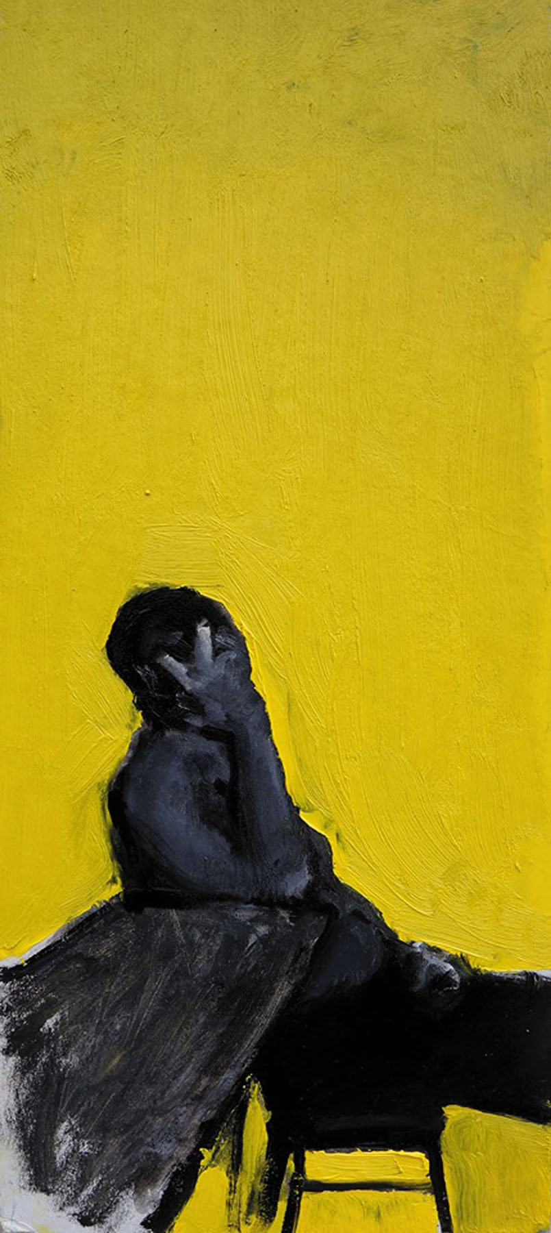 "Super-space" Александра Чурсина — это какое-то мазохистское наслаждение феноменом безысходности. Экзистенциальное состояние внутреннего одиночества, которое из понятия становится образом, выглядит космической притчей, а само произведение — ярким эпосом театральной трагедии личности. Локальная яркая заливка, заключенная в вытянутый объем фона, изолирует скомканную серую фигуру в одном ей ведомом мире, с этой кажущейся бесконечной, но какой-то завораживающей густой пустотой макро-микромира. Звездное небо над головой и нравственный закон внутри тут метафоричны и условны, но суть этой вывернутой наизнанку человеческой души осталась.