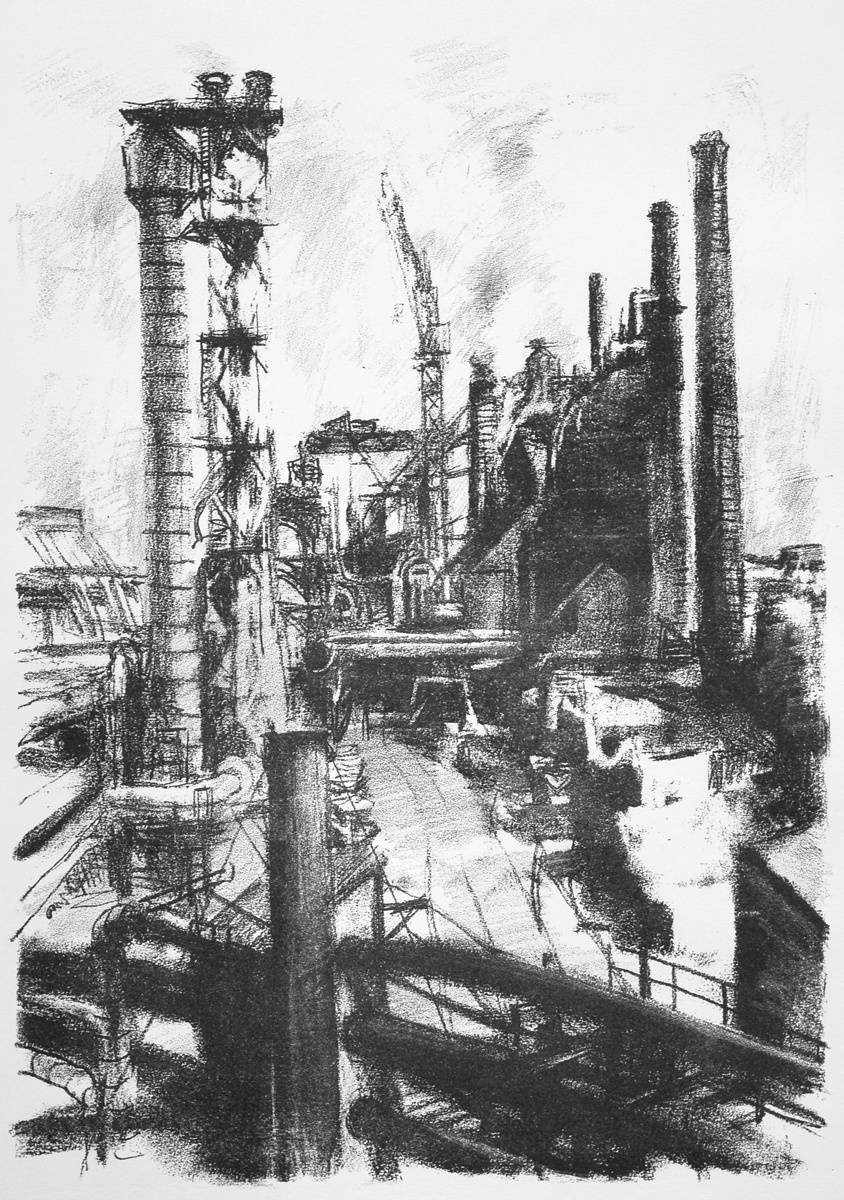 Путь художника «интеллектуального агента» — это путь от обратного. В «Листе №9», серия «Завод. Рисунки», перед нами конструкции не столько того, что видел художник, сколько того, что он об этом думал. Тут тонко вводится некий неучтенный элемент. Гигантские механические формы безлюдны и молчаливы, в этом состоянии они передают собственные образы, некие эстетические симулякры какой-то эпической тишины. Величественной тишины индустриальных форм в современном российском пейзаже.