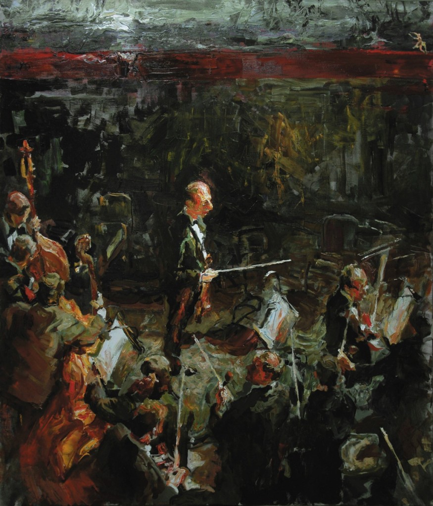 «Оркестровая яма» Константина Лупанова... Мы не можем не коснуться воистину симфонической, красочной инструментовки этой картины-образа. Бешеный «allegro» мазков, нарастающее «presto» световых пятен при условно статической композиции заставляют нас внимательно всмотреться, и мы замечаем еще одного персонажа картины, имеющего свое особое значение, свою живую натуру: это свет, странным образом доминирующий в картине. Его фрагменты, брошенные на холст, несутся, сталкиваются, вновь разбегаются, уходят в хаос… Похожие на черточки точки, кляксы, запятые — это стенограмма света, рельеф которой образует восхитительную, живописную фактуру, пространство картины становится как бы вздыбившимся и напряженным. Сила этого контраста, сила этой удивительной живописной манеры рождает ощущение, что этот яркий, переливающийся мир окажется взорванным изнутри клокочущей где-то в его недрах разрушительной музыкальной силой.