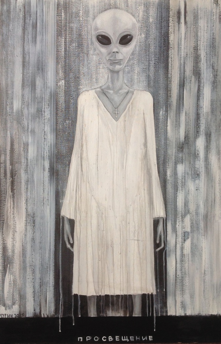 В «Просвещении» Вадим Мурин выбирает эмоцию изобразительного языка своим оружием в борьбе с косностью. Картина не просто дань времени, но природа личности художника. Странная светящаяся фигура инопланетянина. Подчеркнутое одиночество, реальное или вымышленное, отсутствие повествования. Динамичное выражение состояния приобретает особую остроту благодаря центричной композиции, напряженной активности света. Перед нами смысловой аллегорический образ, ведущий диалог языком живописи.