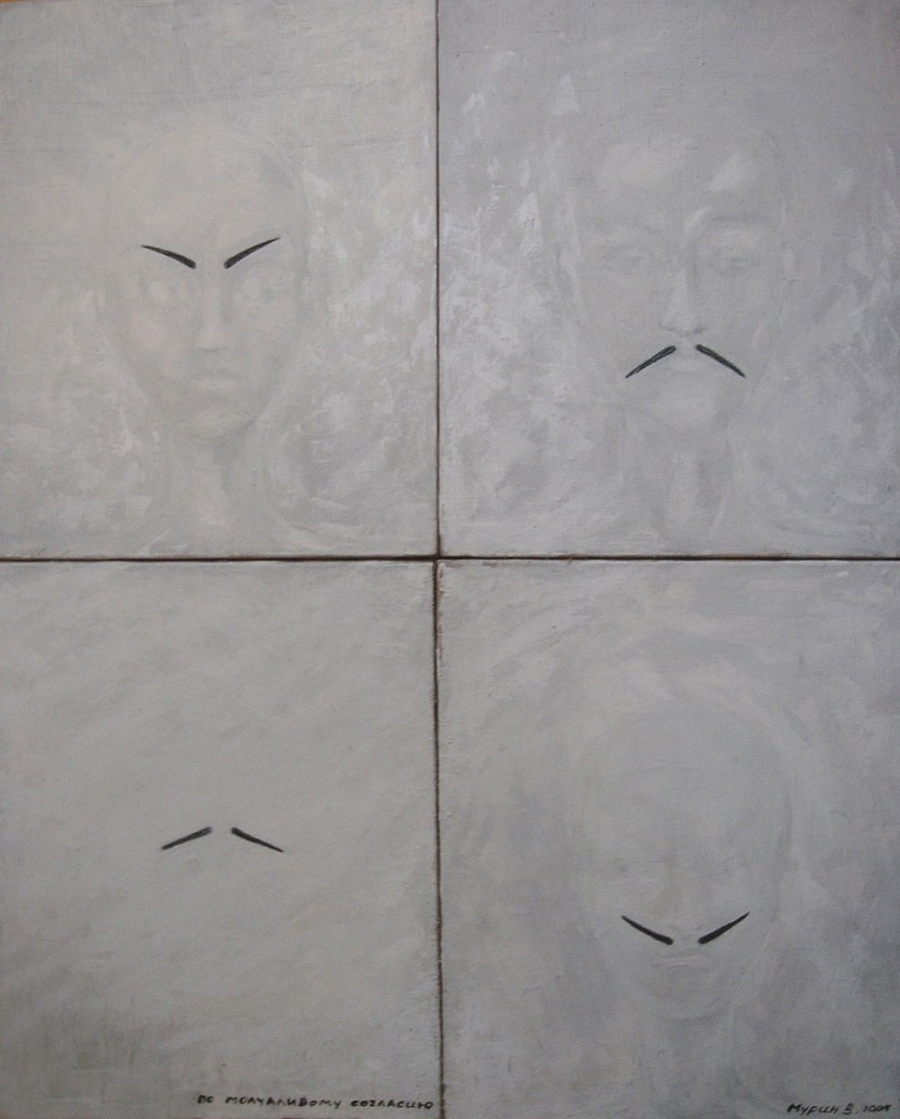 «По молчаливому согласию» Вадима Мурина — это нечто из области «преобразить мир и способствовать гармонии на земле». Это некий абстрактный фактурный объект, в котором художник решает проблему «неограниченности возможностей». Задумавшись над грандиозной сущностного беспредметного, осознаешь всю ее непомерную сложность. Если измерить различные составляющие, то обнаружится, что только пропорции самого холста действительно рациональны — он представляет собой правильный прямоугольник. Все остальное в голове у художника. Те, кто имеет дело с беспредметными формами, например, архитекторы и дизайнеры, острее воспринимают всю сложность и неповторимость подобной работы.