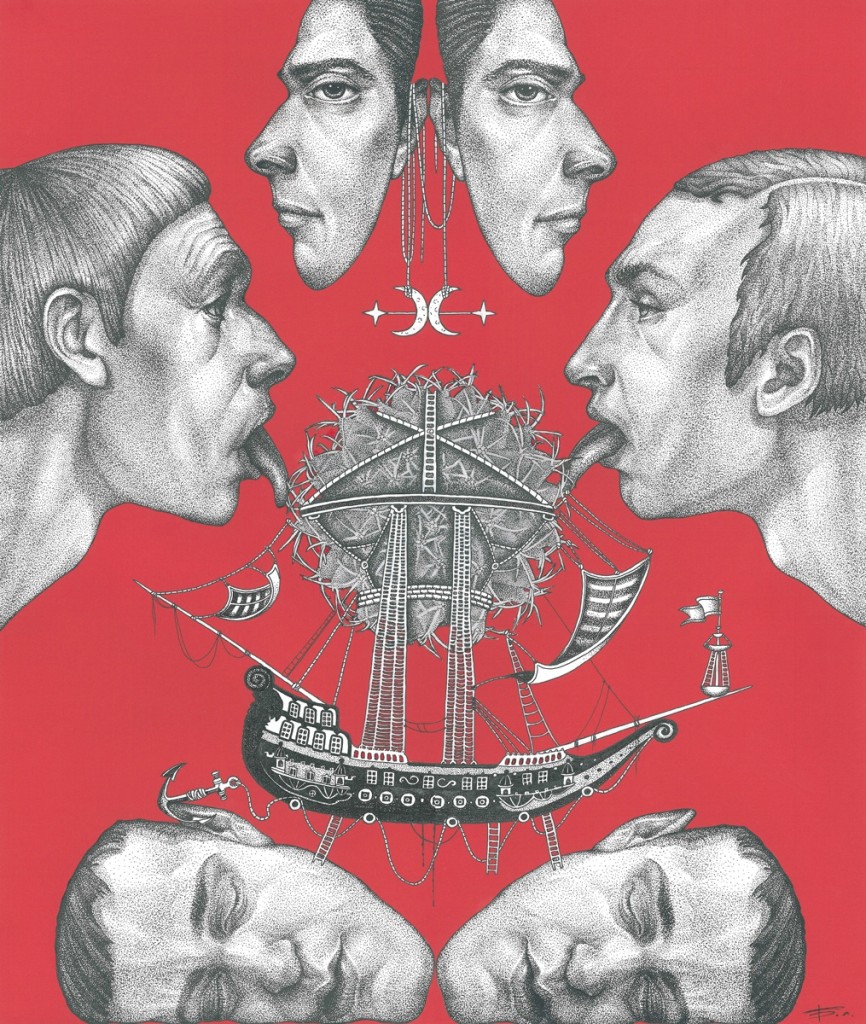 Принципы децентрации и фрагментарности — одни из основополагающих принципов реальности мирового порядка в эпоху постмодернизма с его тотальной несерьезностью и неограниченной свободой. «Опиум или сновидения» Людмилы Барониной несет в своей основе подобную смысловую модель. В этом зеркально-неправильном мире является символический образ многозначной и ускользающей от логики действительности. Реальность интерпретируется как множественность, состоящая из отдельных, разрозненных фрагментов человеческих лиц, персонажей и символов, симметрично отраженных на локально-красном фоне. Вселенная предстает здесь вне какой бы то ни было возможности создать ее целостный образ. Подобная модель мира отличается динамикой, случайностью и непредсказуемостью.