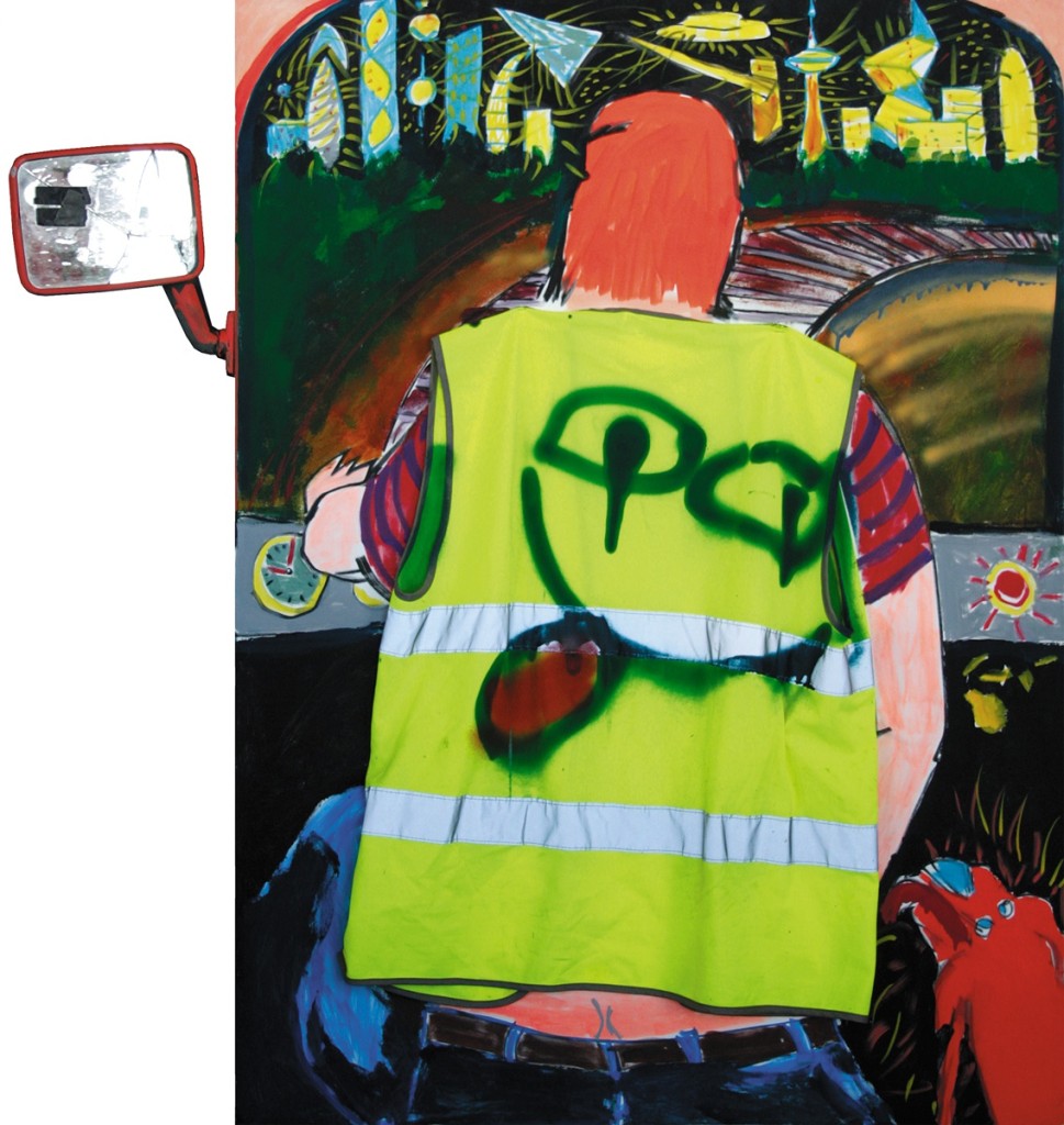 Lot 89 Year: 2014Material, technique: 2014. Canvas, acryl, oil paints, markers, road services worker's vest, side mirror from Volkswagen Transporter manufactured in 1983