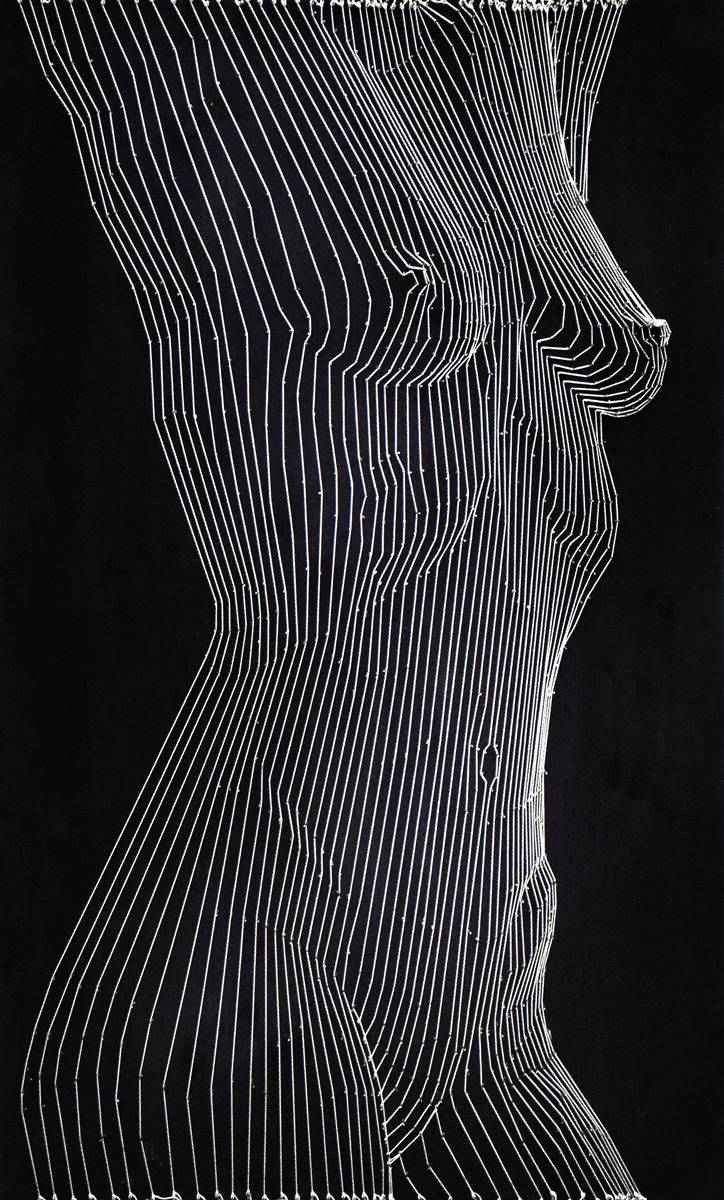 Натянутые, словно струны, нити формируют гибкий статичный силуэт обнаженной фигуры, символизирующей трогательную хрупкость красоты.