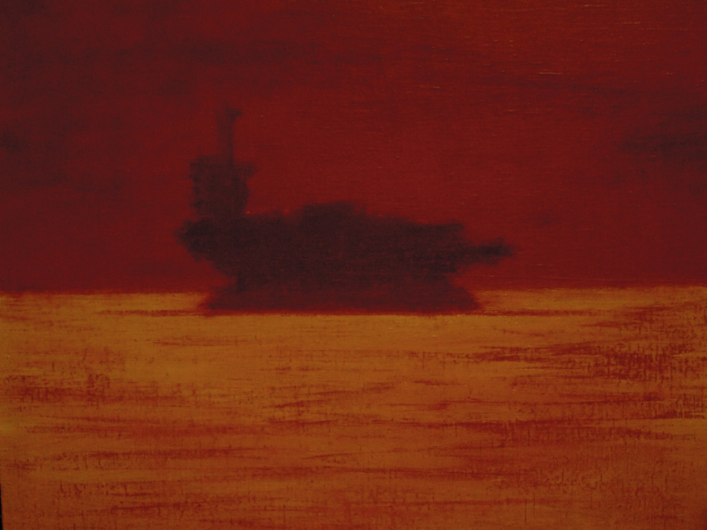 Размытые очертания боевого корабля на насыщенно-красном фоне не несут потенциальной угрозы, а воспринимаются скорее как визуально красивый объект, попавший в поле зрения художника