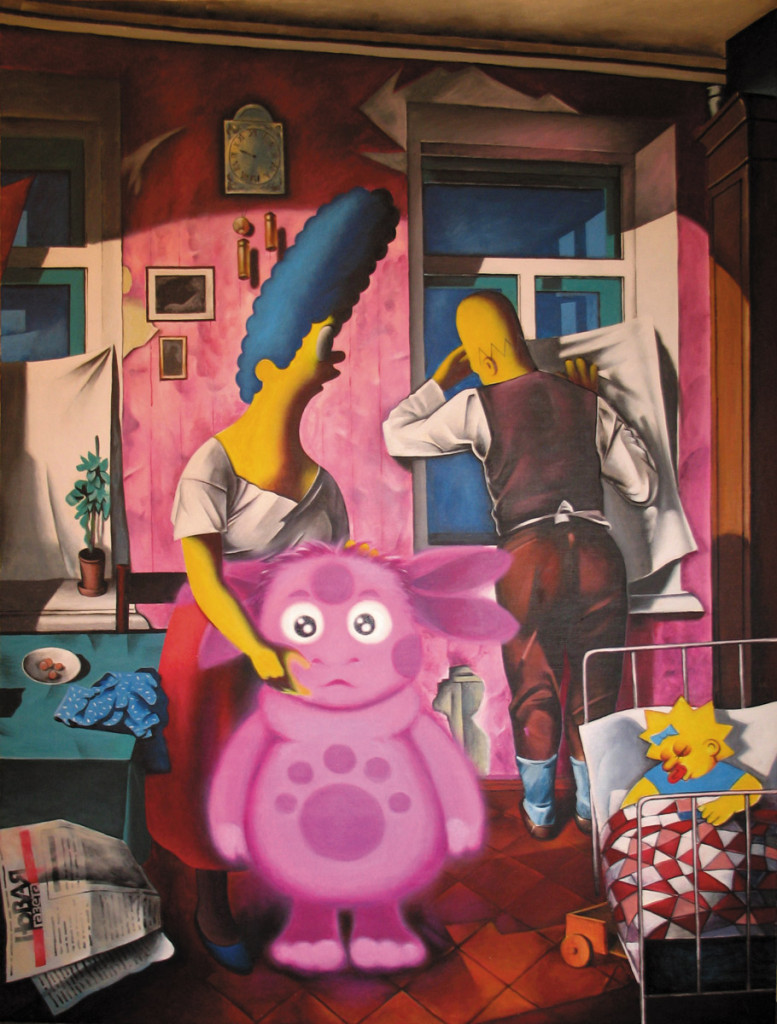 Героический пафос одного из знаковых произведений советской живописи нивелируется заменой персонажей картины героями популярных мультсериалов, лишая изначального смысла сюжет произведения.