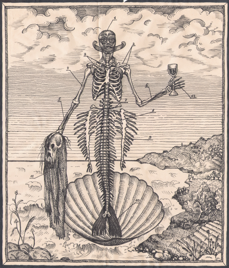 Mermaid appearing as sea-born Venus, at the mercy of the author turns into a skeleton with no skin cover deprived of its mystic role of a creature from people’s superstitions.