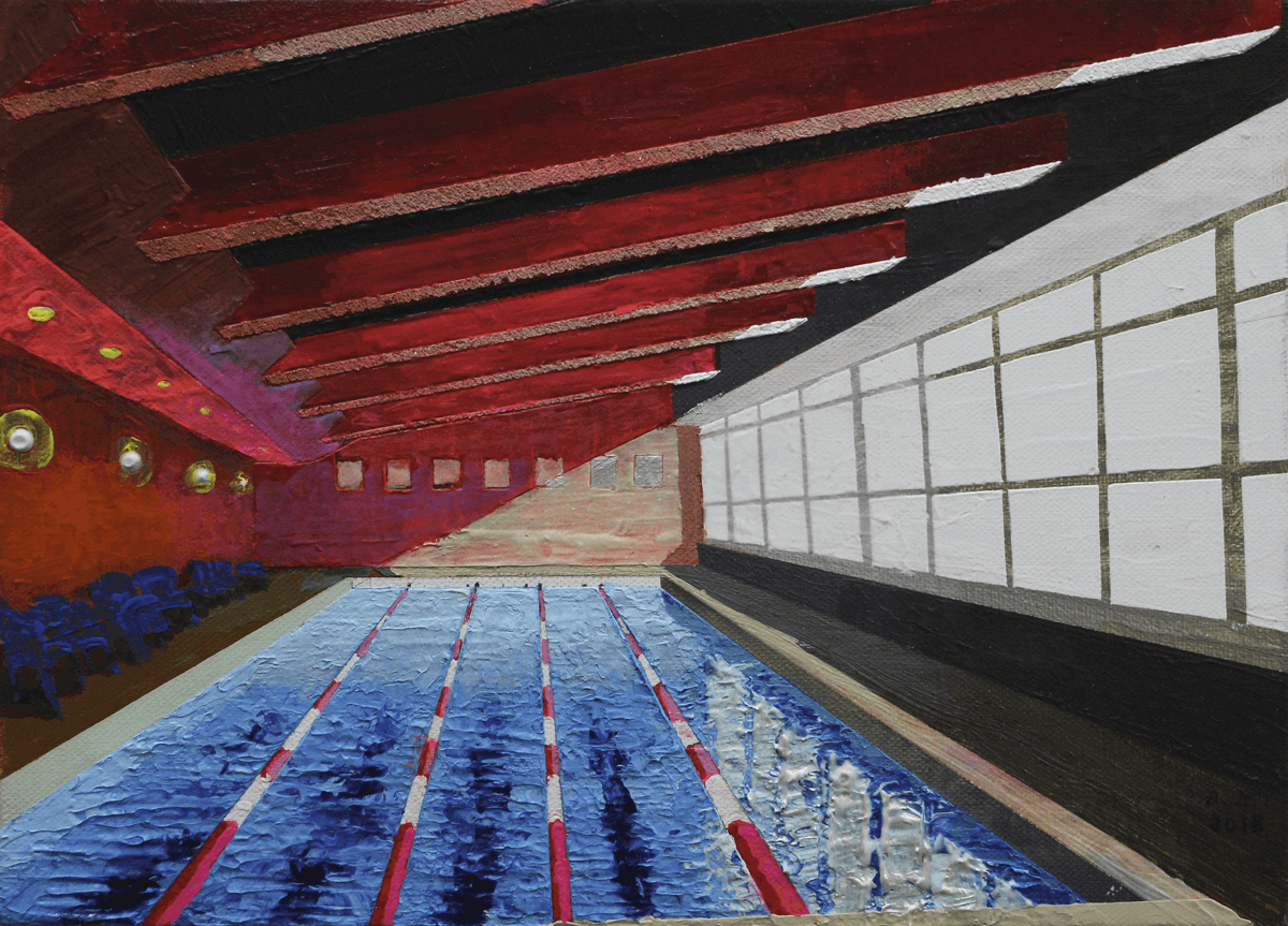 Aleksandr Dashevskii is interested in architecture and the human relationship to space, bringing us to “Swimming pool” (2018). This piece emphasizes the strict architectural design of the swimming pool (beams, windows, lane lines), and how the light coming in from the window evenly divides the space into a balance of light and darkness.