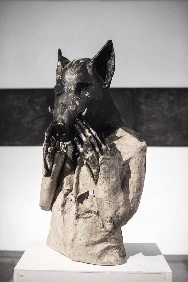 Masha Bogoraz was born in Rostov-on-Don and studied at the Grekov Rostov Art School. Bogoraz works with performance and sculpture using papier-mâché techniques, fabrics and other materials. She has participated in both the VIENNAFAIR and Art Paris international fairs. The sculpture “Boar” of the “Survival Conditions” series is made from papier-mâché, emphasizing the sensual duality of Masha’s sculptures. The cold metal frame is covered with the soft, flexible, papier-mâché — expressing, on one hand, the beginning of technogenic times and the machine, and on the other, the animal, irrational and chaotic. Reminiscent of cyborgs, biomechanical creatures that emerged from cyber-punk work, these sculptures are both tactile, emotional and disturbing — as if Giger’s heroes are suddenly endowed with intimacy and ultimate embodiment of the works of Louise Bourgeois.