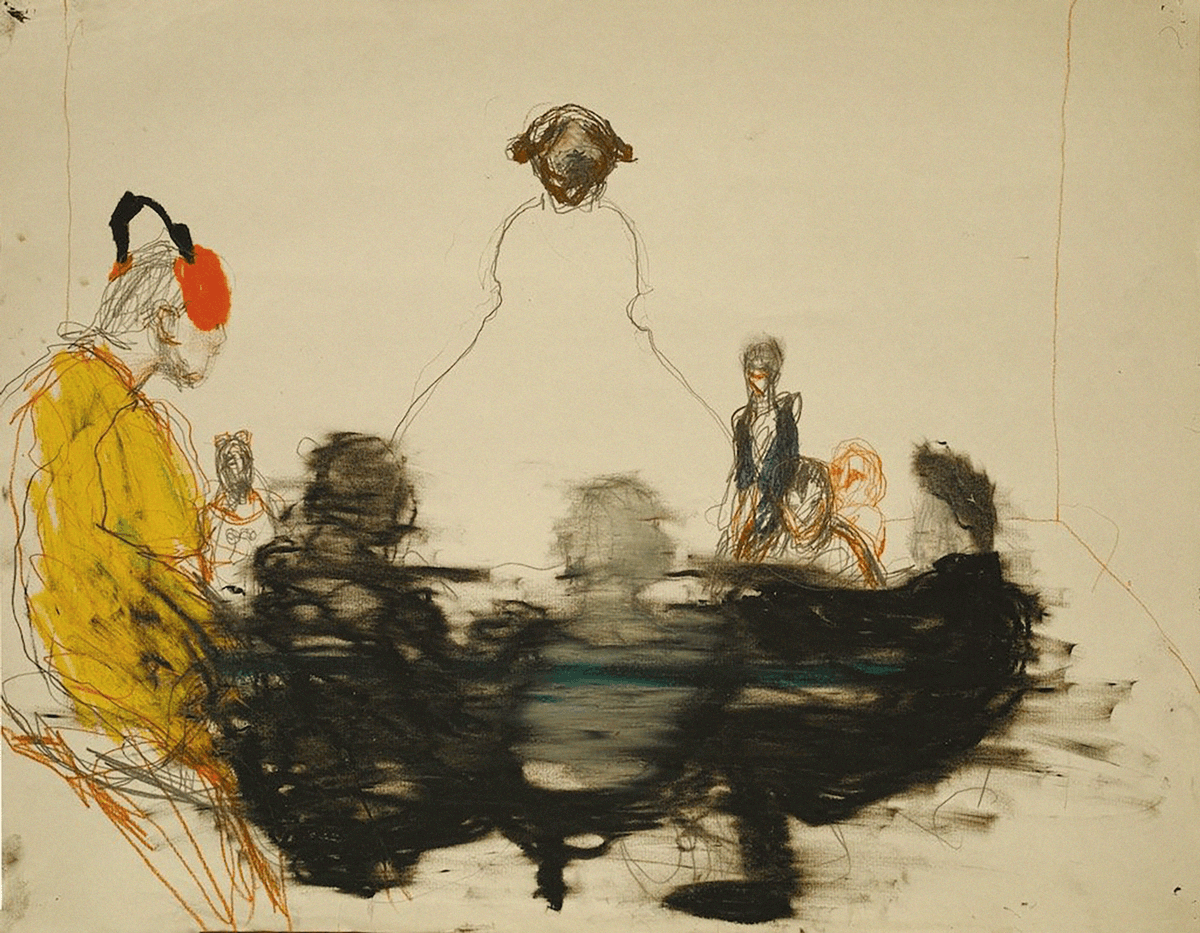 Material, technique: Paper, pencil, oil pastel