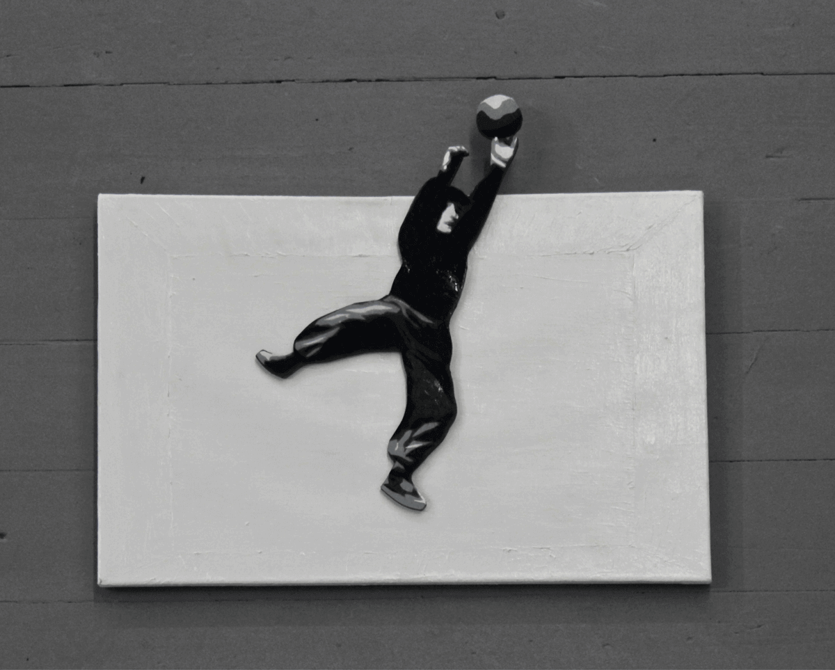 Born in 1990, SlavaPTRK studied at the Department of Journalism of the Ural Federal University and at the “Free Workshops” School in Moscow. As an artist, SlavaPTRK is famous for his street action pieces, stencils and stickers. He also works with installations, sculpture, painting and graphics. The themes of his work are often socially and politically fueled. In 2019, his large solo exhibition was held at the Moscow Museum of Modern Art.politically oriented. In 2019, his large solo exhibition was held at the Moscow Museum of Modern Art. The influence of street art can be felt in all the works of SlavaPTRK. In “Protection”, the traditional “canvas + acrylic” are supplemented by fiberboard and the technique of applying paint on the stencil, which makes the contours of the image clearer, reminiscent of street graffiti. The theme derives from his times — like those of many others — playing street football.