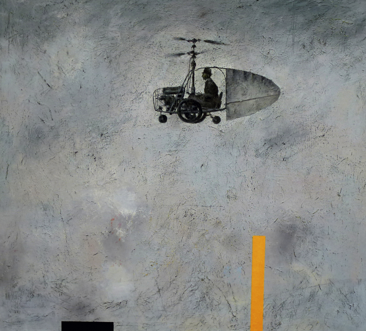 Gennady Kuzkin is a Kuban artist. He was born in Abinsk, Krasnodar Territory. Gennady is a member of the Union of Artists of Russia, a participant of municipal, regional, and international exhibitions. In 2018, after the DKhSh Art Group and the Last Exhibition of G. V. Kuzkin, he starts working under the name of Tim Vilgan. The new paintings preserve the recognizable conventional decorative texture used by the author, as well as his color and format preferences. The graphic emphasis of the stroke texture creates multiple reflections of the dull, gray and hostile space of the background. An old-fashioned aircraft takes the central part of the work. It seems that it looks to the past trying to hide from the unforeseen saturated yellow and dull black geometric shapes that balance the composition and become the trigger that cause the phobia of modernity.