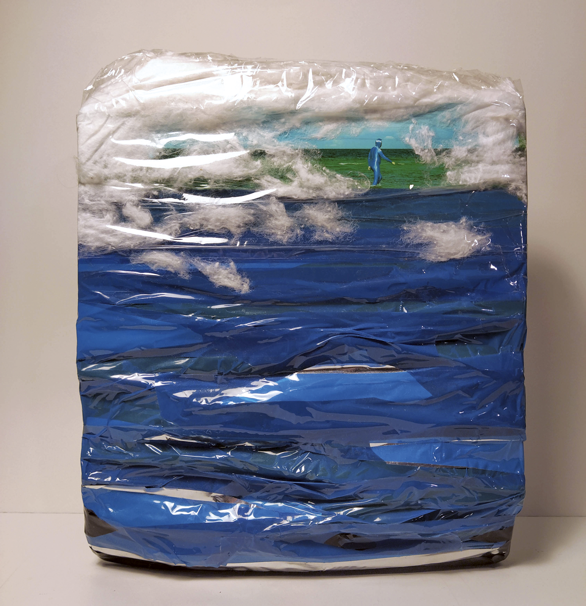 MishMash Project appeared in 1999 as a creative collaboration of two artists: Masha Sumnina and Misha Leykin. They became the artists of the year at Cosmoscow in 2019. MishMash create their absurd conceptualism that offers a clear view at the exact coincidence of accidental events and fight poisonous ideologies and persuasive interpretations. Resistance to the existing trends creates a new art movement – hideoism, a movement that is, essentially, a spontaneous belief that embodies the truth of the world order. This work is plastic; the horizontal rhythm of the object in the bottom part is gradually eclipsed by the growing dynamism of the gray heavy sky crowned with the white waves of the tape. If hideoism does involve some constant matter that holds all elements of the universe together, it is tape. Like a patch on a beach ball or a target in a shooting gallery, the foreground of the work presents SuperJew – an anti-superhero in a bright outfit from an earlier MishMash project created in 1997 – rushing to help. Where is he running? Whom can he help? It remains a mystery. Perhaps the point is just to enjoy the process.