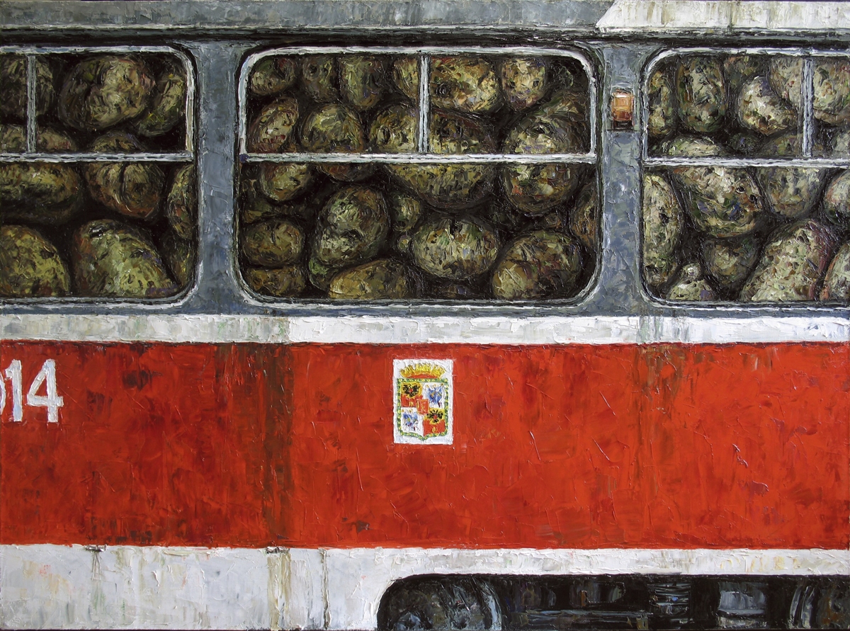 Dmitry Prokopovich is an artist who was born and grew up in Crimea and has been living and working in Krasnodar since 2012. Having moved to Krasnodar, he started an active artistic assimilation by painting Krasnodar city skylines. His paintings are characterized by dense texture and relief, calibrated classical compositions implanted in him together with his classical education. The colors in his works convey the basic mood of his works; his scrupulous handwriting borders calligraphy. This work is to be viewed from a distance; the canvas space is divided symmetrically into two horizontal fields. The tram is fit into the picture the way that the main color emphasis – a red line along the side of the car – results in visual distortions. The upper part echoes the title of the work by crushing the viewer with its dominant brown palette. Semantic irony of the city traffic is supported by all elements of the painting.