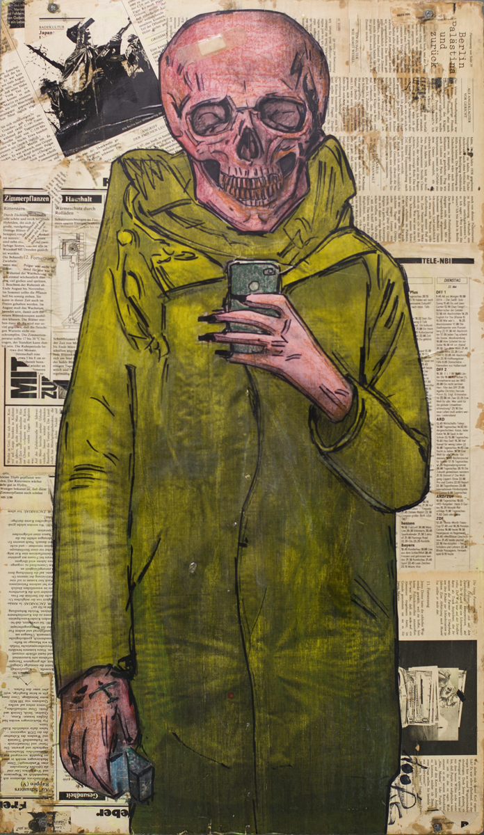 Sergei Rozhin is a young Russian artist who was born in Yekaterinburg and currently lives and works in Moscow. Transferring from street art to book illustrations and objects, he preserved alignment and overlay of layers of meaning. The auction presents his work from the series of newspaper collages. Sergei is a participant of the 3rd Ural Industrial Biennale of Contemporary Art; his works have been exhibited in the PERMM Museum of Modern Art (Perm), PG ART GALLERY (Istanbul). He is also a participant of VLADEY auction. This work, Face, also features the theme of relationships of the artist with printing and illustrations. The author makes the background architecture from newspapers – the collages from a German newspaper become a means of reviewing and analyzing of stranger and even alien texts to create a romantic mythology. He combines this layer with another, quite an unexpected motif, in particular, with illustrations drawn on top of the newspapers that look as if they were taken from an anatomy atlas and show the structure of the human skull. This way the character appears before the viewer in the aura of the human body and outer bright vivacity toying with the audience and their perception.