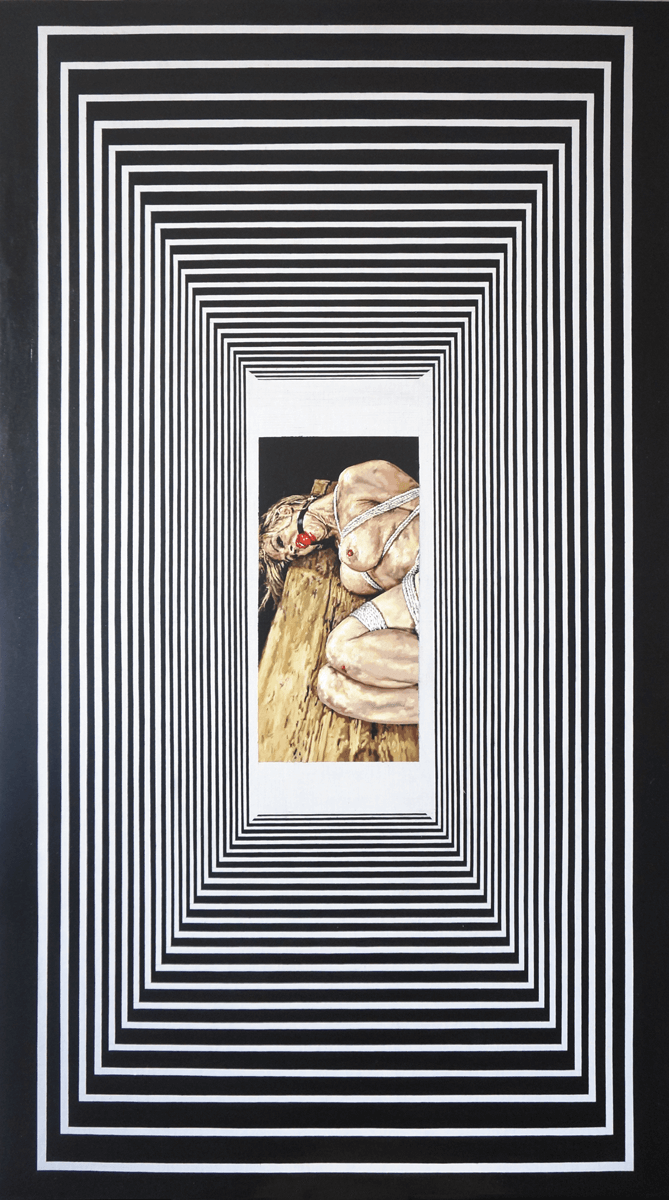 The narration within this work is transferred through a freeze frame surrounded with unnatural contrast concentric geometry. The combination of these components creates internal tension — visually harmonious, it conflicts with its own meaning – a certain inversion of expressionism is born, a trauma of the painting surface as pure horror and a shot in the direction of the viewer.