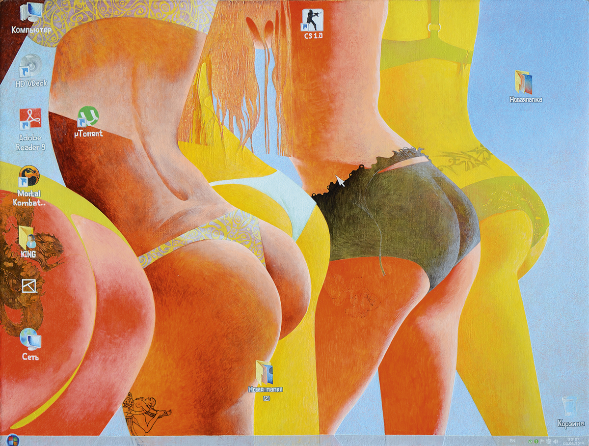 Konstantin Slepukhin is a Russian artist, sketcher, painter. He was born in Dmitrov, Moscow Region, where he lives and works at the moment. His works have been exhibited in Malmö, Sweden, Singapore, Hong Kong, Germany, etc. His works are in private collections in Russia and abroad. This work is pronouncedly theatrical, sham. It depicts gaudy female figures that the author portrays as ‘beauties’ — perfect women devoid of arms, legs, faces. Young, overly sexy bodies, they are frozen in the decorativeness of consumer kitsch, like an advertisement. Bright colors refer to the influence of social art. All this can certainly be perceived as a metaphor of the virtual world and theoretic happiness of life in the beginning of the 21st century and a monstrous gap between real life and existence of the soul.