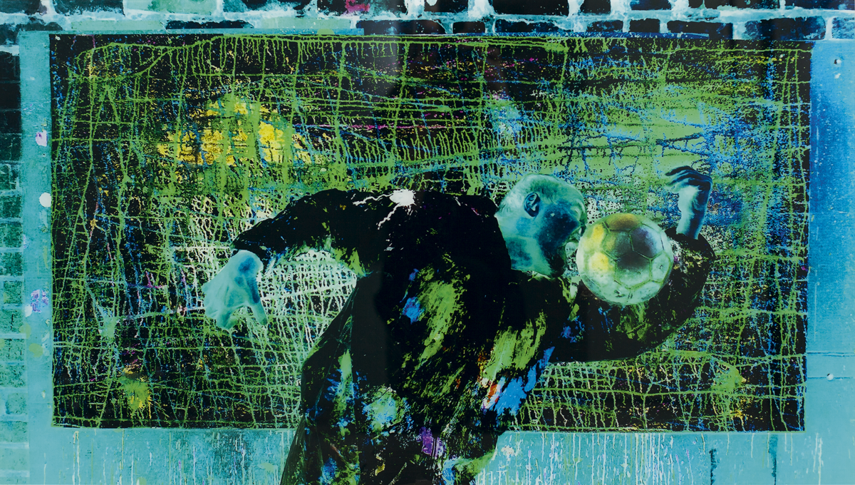 The creative duo of Valery and Natalia Cherkashin, significant artists of contemporary Russian art. Since 1983, they have been engaging in performative practices, photography, painting, drawing, work with objects. Their works are in the collections of the major museums of the USA; in Russia, they are presented in the collections of the Russian Museum, Pushkin State Museum of Fine Arts, Russian Culture Fund. Their works usually exhibit semantic and plastic ambiguity achieved through the use of digital photographic materials and mixed media. This horizontal sketch is made using the multilayer photopainting collage technique. It is closely related to the color and post-cubist abstractions of the first half of the century with which Valery actively experimented back in the 1980s. This work exhibits dynamic diagonal composition implemented thanks to a large figure of a soccer player suspended in flight that is the main focus of the work. In conjunction with the modernistic segregation of forms and colors, these elements fill the work with incredible energy and intensity.