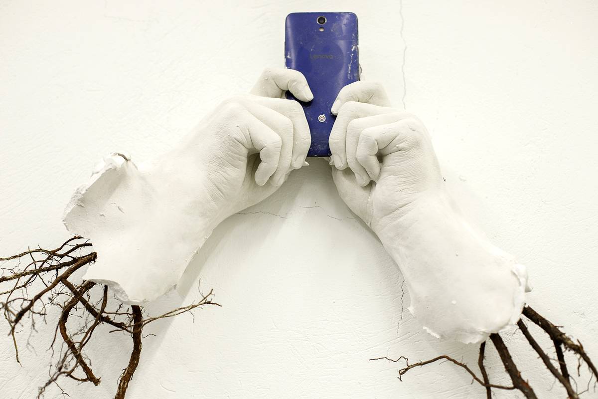Mayana Nasybullova is a contemporary Russian artist dwelling and working in Novosibirsk. She works with the theme of collective and personal memory, creates her own ‘artifacts’ of epoxy resin, plaster, silicone, and ceramics. Her project Current Amber was included in the Triennial program of Contemporary Russian Art. Mayana is a participant of VLADEY auction; she also cooperates with the OSNOVA gallery. Another work from the Body Experience series, a kind of semiotic model with a social discourse. The triangular composition divides the work into three levels. The first, lower, level underlines the original and natural human environment through the use of a natural material – wood. Plaster flexibility of the cast of two hands maneuvers between the theme of bodily practices and symbolic reflection of the human social evolution. The pyramid is crowned with the symbol of the new information environment.