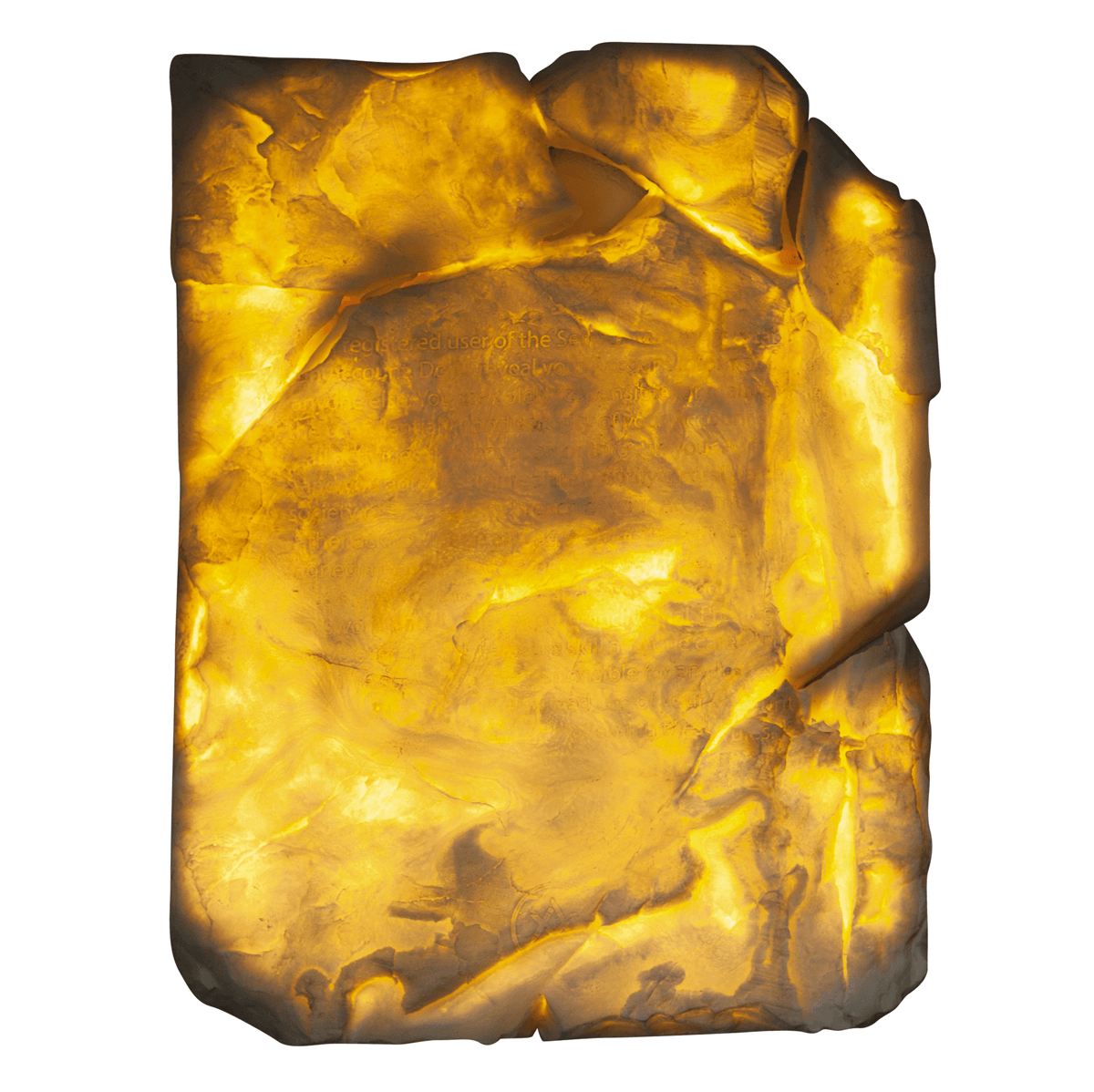 Recycle Group was established in 2008 by Andrei Blokhin and Yegor Kuznetsov, Krasnodar artists. Already in 2010, they win the Kandinsky Prize. They took part in the parallel program of the 56th Venice Biennale (2015) and the Russian pavilion of the 57th Venice Biennale of Contemporary Art (2017). In 2017 and 2018, the art group was included in 49ART Russian Investment Art Rating. Tablet of the Covenant by the artists of the Recycle Group exploring the post-Internet culture. Despite the study area, we can see a persistent appeal to objectivity meant to underline the materiality of the object that imitates an even more material source. This tablet is an example of art that dialectically seizes the myth with the purpose of its further processing rather than denouncement. Riddled with inscriptions, the plastic tablet ensures physical immortality of the Internet culture.