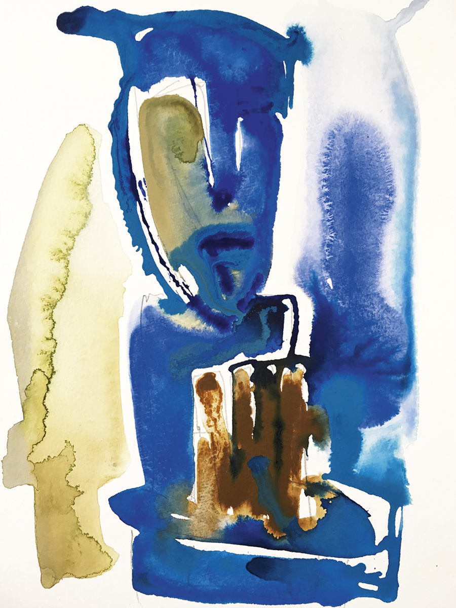 Imaginary vagueness of watercolors gets shattered at a closer look. The pagan figure comes through the vertical shape; personal becomes public. The stern and impenetrable face produces forgotten archetypal fear that calls for tributes and sacrifice. Curiously, the artist chose this image to portrait the museum’s visitor, while museum institutions are often willing to sacrifice their independence and, sometimes, dignity in return for visitors’ favor.