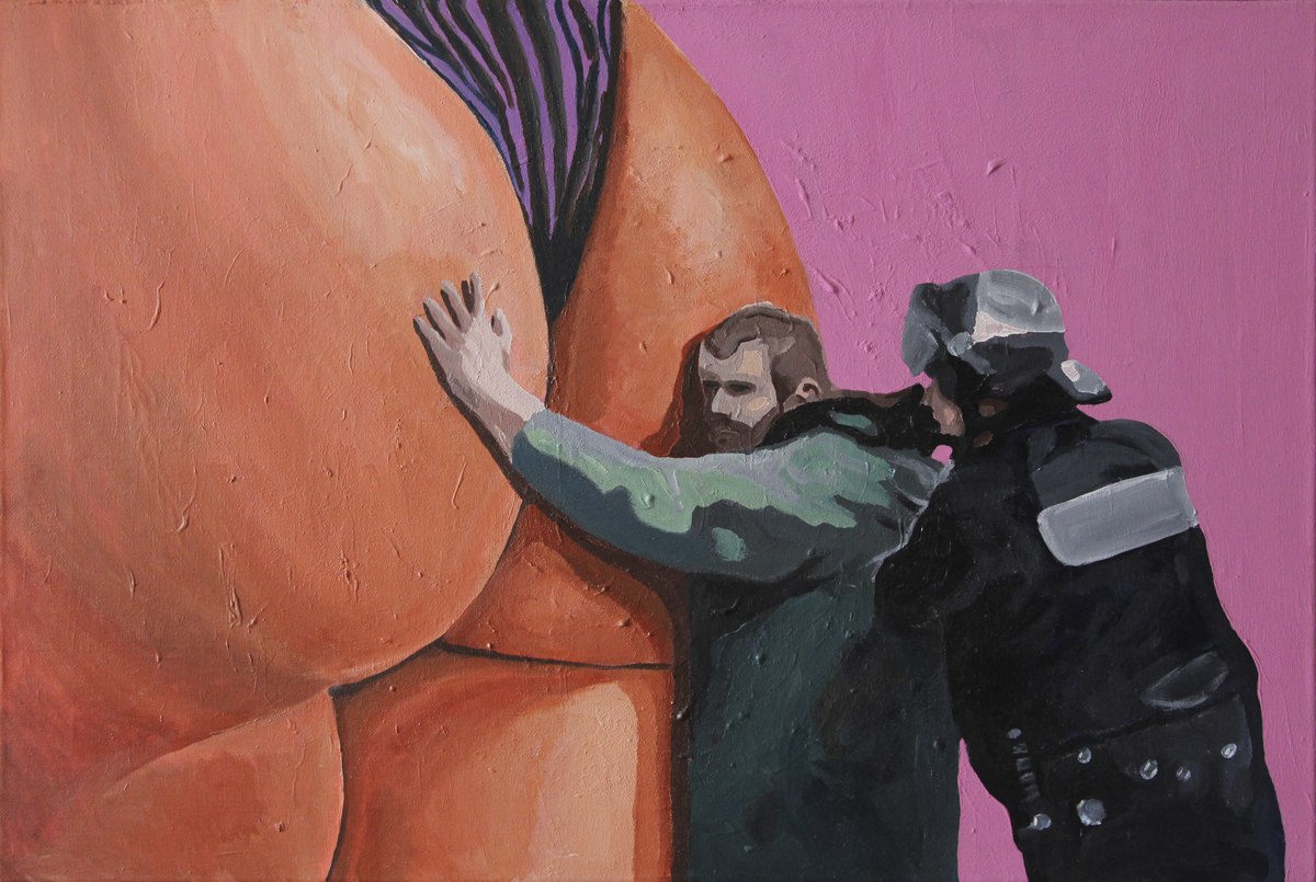 Kirill Stefanov is a Moscow street artist, a member of the ZukClub art group. The artist has a wide portfolio of personal and commercial works, both in Russia and abroad. His most ambitious projects include a skatepark in Lugano, Switzerland; portraits of Eisenstein, Skryabin, and Bulgakov on buildings in the heart of Moscow; Cage mural in the Museum of Street Art (St. Petersburg). Lately, he has practiced easel painting transferring the dominants characteristic of street art to the canvas. Street art no longer wants to remain on the streets – anger and marginal environment have smoothed and followed the desire to become a full-fledged genre of contemporary art, to be studied, to get into museum collections. Radical manifestos have become a thing of the past resonating in the air as loud cries “Jiggers!” thus announcing police approach. In the events of 2015, structural violence was scaled and highlighted the suppression of street art allowing the author to use two semantic fields. Photography mockup amazingly emphasizes the ironic shift in the political confrontation.