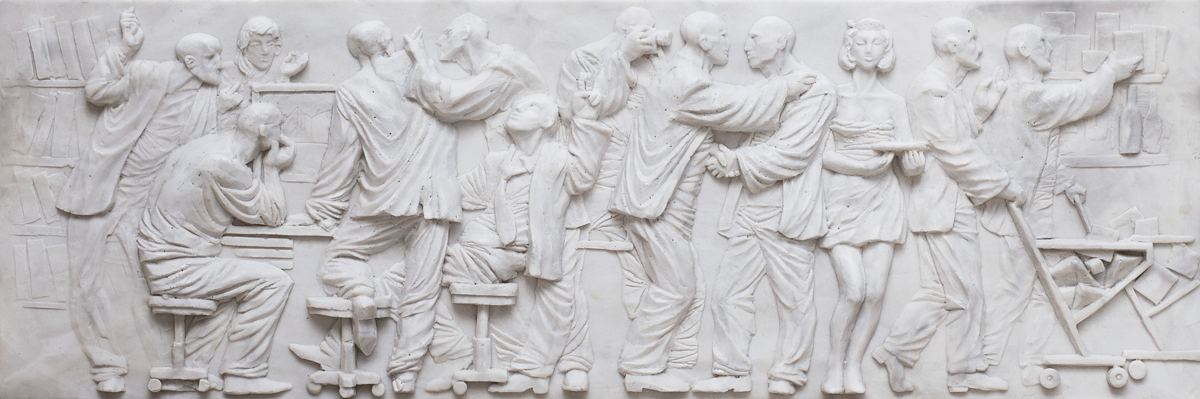 This is a panel stylized as bas-reliefs of Stalin-era Empire. The white cement bas-reliefs depicting the everyday life of Soviet workers, were often placed on the facades of buildings. The artists repeat the principles of their composition and focus on the rhythm by means of carved shapes. This work as an architectural element is a ‘ruinized’ ghost of the ‘utopia of civilization,’ the mummified past of our present. Information society will sooner or later perish leaving only memories of its past greatness. Sublimity of the theme, the academically calibrated image, and carelessly, as if accidentally, missing elements is the greatness emerging through time.