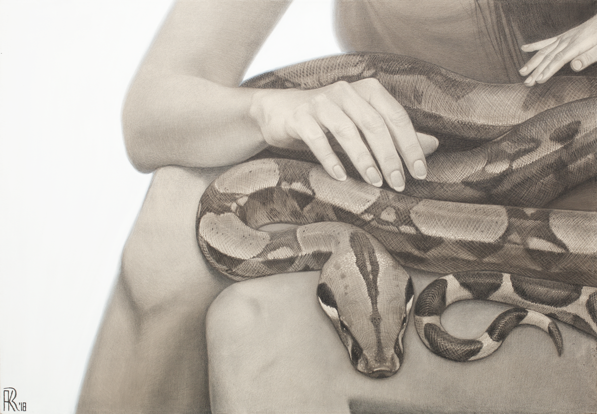 The concise monochrome roughness of the canvas dominated by the sketchy foundation creates a sense of cinematic vision. The artist focuses on the light tone and conditionally splits the canvas leaving a lily-white space behind the cropped female figure, thus underlying the neo-minimalism style of the image. Anastasia skillfully plays with luminosity, uses meticulous tonal vibrations and manages to convey all the subtle aspects of the canvas space.