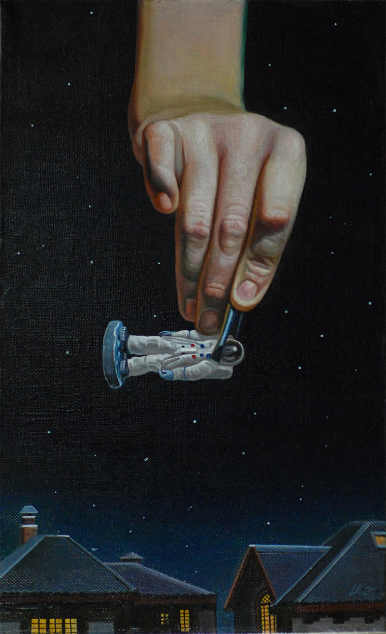 “Space is our” is a work from the artist’s new series. The night sky above the village is cut by a hand with tweezers in which a figure of an astronaut is squeezed. Korshunov, whose artistic practice is linked to the search for the divine in everyday life, offers a theme variation of the hidden forces influencing the history. The scaling game sets the temporal perspective: who is the owner the hand, and who are “we” — those who own the space?