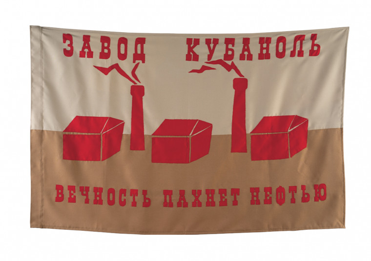 “Flag of the Kubanol plant” is a part of artistic research, in which Yana Alalykina turns to the history of VKHUTEMA. In this higher art and technical association in Krasnodar, as in any other VKHUTEMA across the country in the first Soviet Union years, an artistic language of the avant garde was developed in order to reconstruct the society on the aesthetic level, creating new humans for the new state. However, the mission was not completed: the constructivist artists were accused of formalism, and the official art switched to socialist realism. There is almost no information about the VHUTEMA activities in Krasnodar achieved. The flag of the Kubanol plant is made in style of the 1920’s, reminding the banners of workers fighting for their rights. However, instead of the slogan the artist places a quote from a song by Yegor Letov. Pulling the avant-garde stylistics into modern times, Alalykina creates an artifact that can push a viewer to re-think the history.