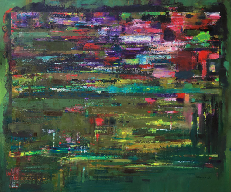 The prevailing green forms the color medium in the canvas space, where a modernist grid appears. Its abrupt brush strokes break up and diffuse the light flaress. The play of light gives depth to the canvas, while colorful layers captivate the eye. The flow of the spectral contrasts creates the main plot of this plotless composition.