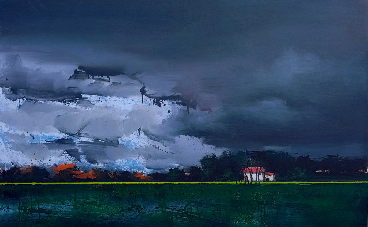 The tension is achieved through the color contrast: bright highlights appear on the canvas dominated by the cool gray and green. Migachev uses the landscape to reflect upon the psychological state. The color medium is structured in a complicated manner; the artist adds several sweeping strokes “over” the image to enhance the impression of the restless and deepening force of nature.
