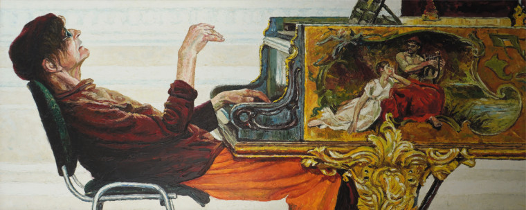 Here is a portrait of the composer Oleg Karavaichuk, the author of the concert, with whom Dmitry Prokopovich shares the title of the canvas. The side of the luxurious grand piano is decorated with a scene of contemplation — an indication of the high level of the music being played by the artist. The slightly pretentious decor of the piano serves as contrast to the simplicity of the chair, on which the composer is placed. His posture looks relaxed; the image itself is detached and tense at the same time: this is a man completely immersed in the sound flow.
