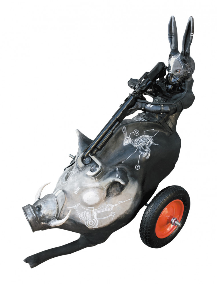 The fantastic creatures of Masha Bogoraz do not belong to this world. One way or another, their images are collected from the elements of our reality. We trace the outlines of animals — a hare and a wild boar, we recognize the outlines of an ancient Roman chariot, we read aesthetics close to cyberpunk. In front of us there is a cyborg mutant — dangerous, swift; touching and sad. The image becomes melancholic as the sculpture makes a visible gap — between modernity, where it looks alien, and the universe in which it could have existed. We suddenly become able to think about this universe and – thanks to the plasticity of the medium – to feel this gap. Then we return to our reality able to describe and understand it for ourselves more accurately.