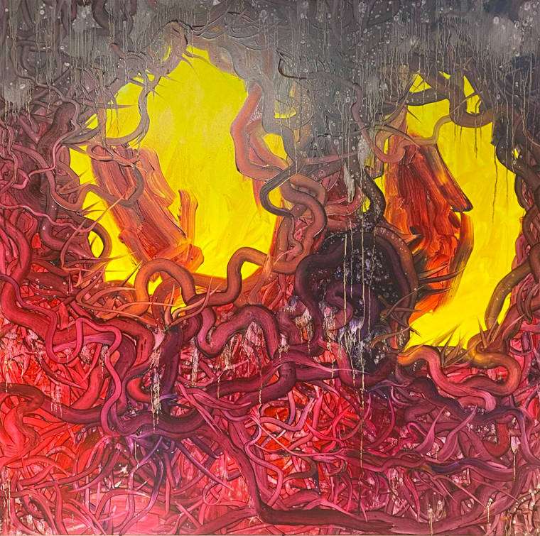 Gleb Gavrilenkov created his own artistic language: he develops and embodies his ideas in picturesque structures that resemble plant weaves or the structure of the nervous system. The canvas is completely filled with them. This is how the distance between a viewer and the pulsating environment is reduced. A visceral rhizome in purple hues catches the eye dragging it into its warm and mysterious insides.