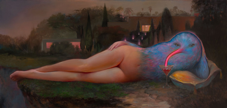 A chimerical creature with a half-female naked body is resting on the edge of a cliff in a typical seductive pose. In the background there is an expensive cottage; the seductive chimera is drinking a cocktail, leaning on a beautiful pillow. If it were not for the bird’s head on this idealized body, this would have been a common scene from an imaginary “beautiful life”, reproduced in Western culture. Refracting this image, the artist invites the unconscious into the space of the canvas.