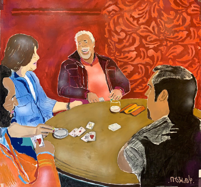 In the painting “In a Fool” the artist reproduces a scene that is often quoted in cinema and popular culture: several men at the table are playing cards. Although their images are quite generalized, the associations with the criminal world come up fast. An atmosphere of risk and excitement is supported by the rich scarlet background. In the recognizable scene the artist introduces elements that expand the field of interpretation: the colored nails of the players, the “half-done” character sitting with his back to the viewer, and the plant pattern successfully merging with the background. A graphite island on a picturesque surface disturbs the uniformity of the picture — another dimension seems to appear over the player’s shoulder.
