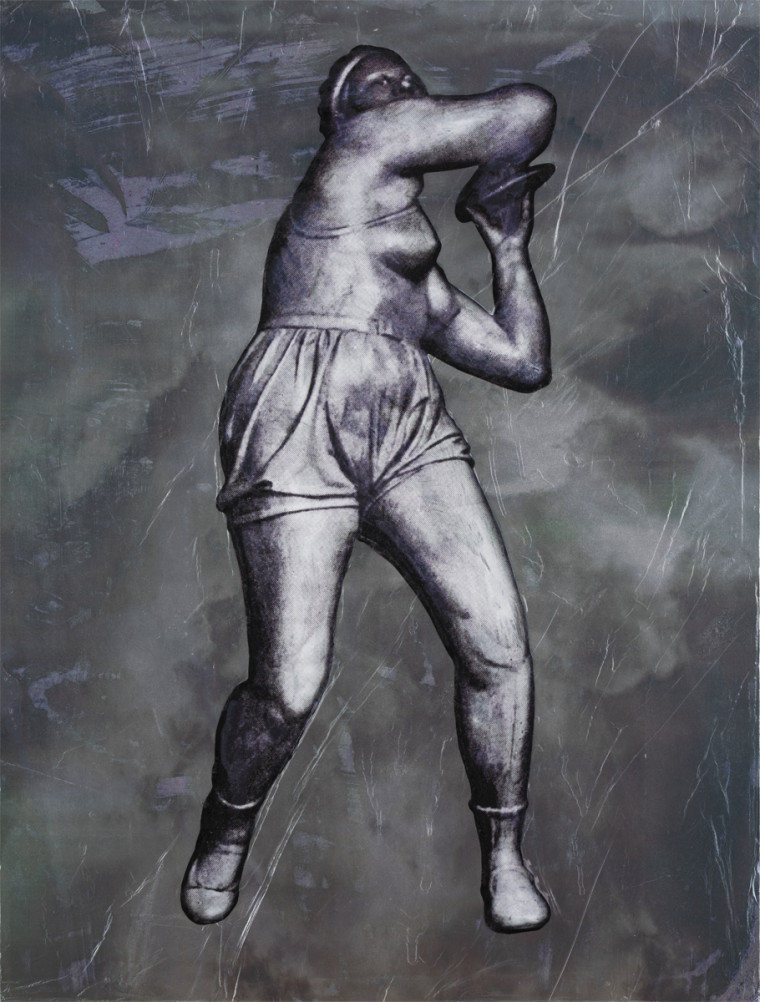 In a series of works made on foil created in collaboration with photographer Ivan Lebedev, the authors reproduce images from Soviet postcards, photographs and sculptural art. The figure of the discus thrower is suspended in the empty space — out of time and context. It is typical for Magaril to search for new perception of Soviet aesthetics: he treats his images with care, trying to discover something deeper than belonging to a certain ideology. Placed in “weightlessness”, the monumental thrower opens up for the viewer revealing a new depth of the image.