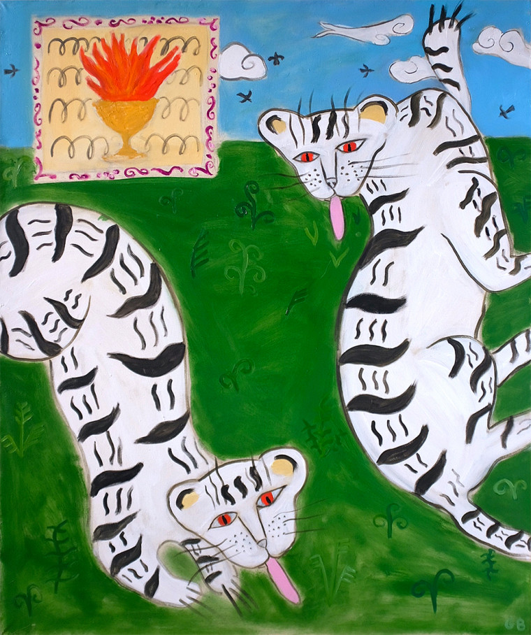 The artistic language of Gleb Baranov is influenced by the Middle East: a rare artist who travelled to those places paints strict monochrome canvases. The warmth of stones and sand heated in the sun, the juiciness of plants and fruits, bold color combinations of bright fabrics — once captured by the artist’s consciousness, they remained with him in his works. Plane composition and ornamentation are inherited from Arabian miniatures. The magic cat is a frequent character of Baranov’s art. It’s a character from dreams or memories, an agent of the unreal world on the verge of the unconscious, linking individual plots into a single universe — a fairyland fused from oriental motives, modernist tradition and pop- cultural optics.