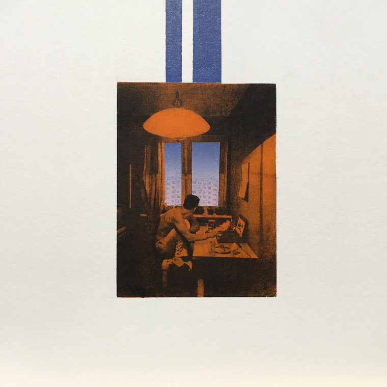 The print shows an ordinary evening: a man sits in front of his laptop in a room dimly lit by an orange light bulb. At this moment he distracted himself from the screen and looks out of the window — at the familiar panel area. The wide white fields of “Dusk” visually remove the image from the viewer, creating the effect of a window through which one can peer into the moment snatched from the everyday life. It is the same as any other evening moment, yet memorable and especially close.