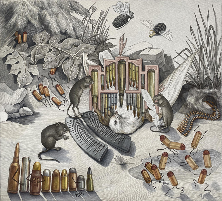 The renowned style of Lyudmila Baronina creates a plot that formally resembles an illustration for a children’s book. A corpse becomes a part of a mysterious mechanism. The mice are busily tuning up something that resembles an organ put together from a dead pigeon and gun cases. All surrounding nature bears the stamp of the inanimate: battle grenades are flapping around on dragonfly wings, a rifle clip crawls into the depths of the earth like a centipede, the growing acanthus leaves is an alabaster. A beautiful and tragic scene becomes a meeting point for the natural and human weapons of destruction. However, there is no man himself in this world, and without him unexpected connections are established between objects. The artist leaves the pleasure of unveiling them up to the viewers.