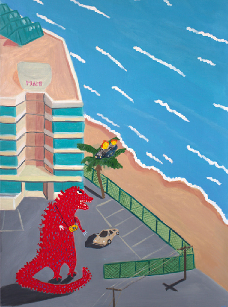 A continuation of the series about Godzilla striving for simple human joys. In this iteration, instead of rebelling the seas and threatening the humanity, Godzilla is seeking an aesthetic pleasure on the ocean shore. Still, the idyll cannot be complete: even in the middle of the peaceful moment a destruction appears in the scene in the form of a burning car stuck on a palm tree. The coloring of the painting reminds of the aesthetics of an adult swim, which automatically gives the image an additional ironic dimension.