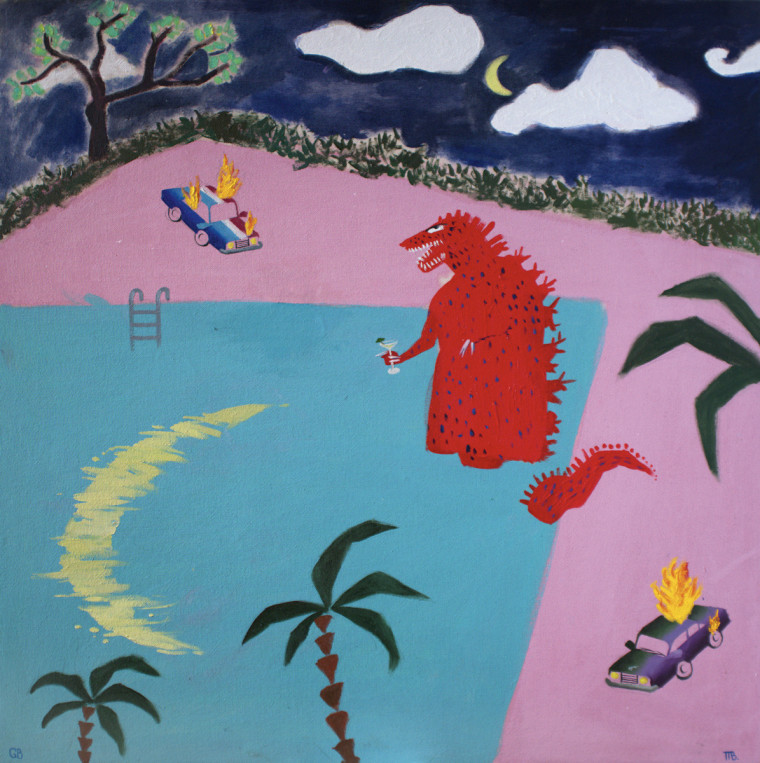 Gleb Baranov is a Krasnodar artist who has been serving as an assistant to the tanker captain for five years. Vladislava Tarasova is a Krasnodar artist originally from Yeisk. Having graduated from Krasnodar Art School (2021), she is currently studying contemporary art and design at MoMA (New York). Lately they have been working a lot together; recent exhibitions include “Psychological Research” in the “Coffee Library” and “Lands of Vak-vak” in the Contemporary Art Center “Module” (Bryansk). Playing with the scale and misalignment of expectations, the artists use references to the pop culture of the 90’s and aesthetics of the videogames. The main character of this ironic work is familiar to the viewer as a monster personifying a threat to the human society. Depicting a catastrophic reptile at the moment of rest and taking care of itself, the artists bring it closer to the viewer: sometimes a monster wants to live in beauty, even though the only candle available is someone's burning car.