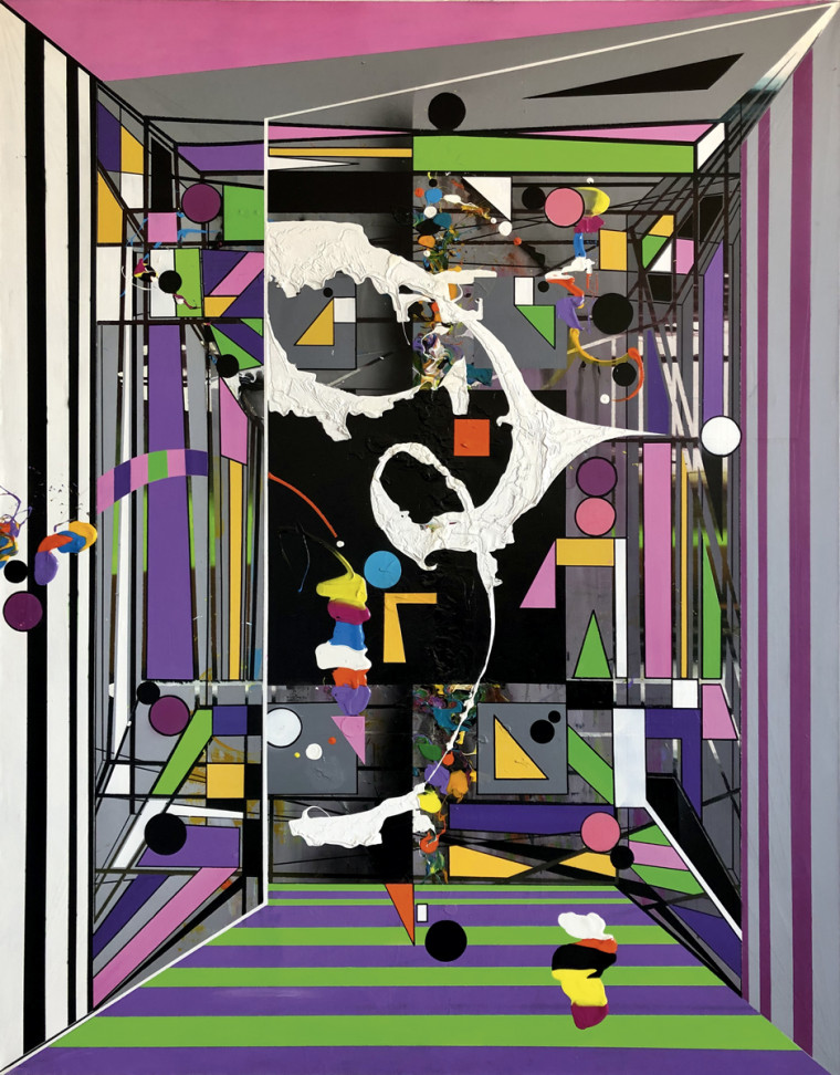 An artist with the classical education, Igor Mikhailenko has been recently experimenting with abstraction. He compares non-figurative painting with photography, as nowadays it is available to everyone both for creation and for perception — at least on intuitive, sensory level. The artist compares his own painting with music, advising to “listen” to it and to pay attention to the emotions that arise. “In room” is a visual labyrinth constructed of the layering and the collision of clear geometric shapes and textured colorful spots — in the space that tries to resolve into an architectural one, but constantly fails.