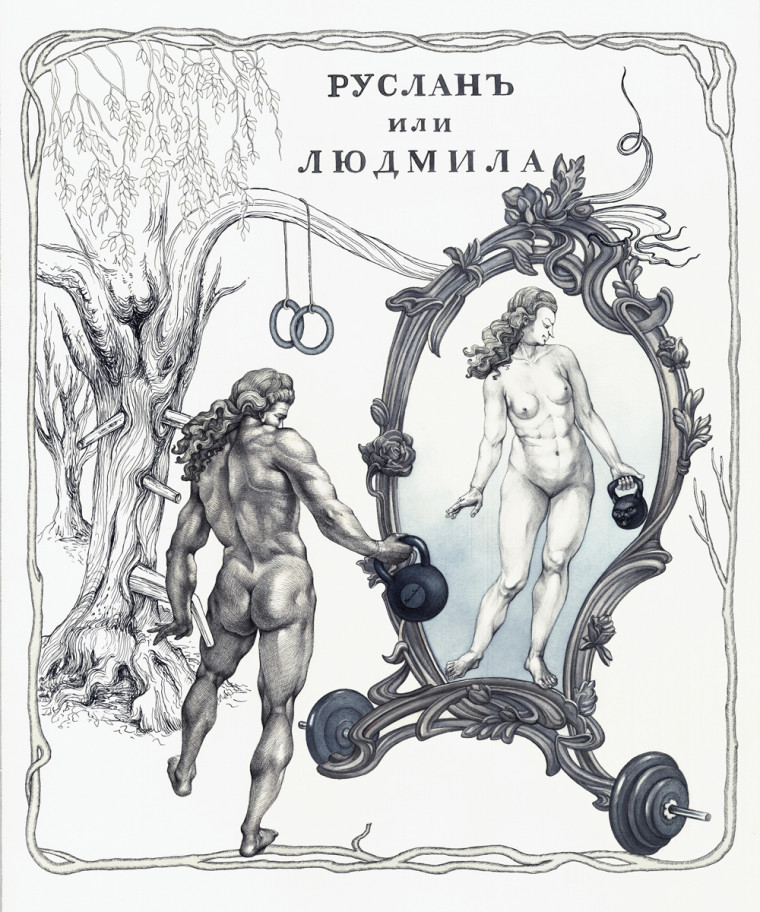 Lyudmila Baronina’s style is inherited from book illustrations. The title of her work refers to the poem that could have plotted the image. However, it is important to note that Baronina’s drawings do not aim at illustrating what is written. One might even say that the image itself is empowered to rewrite and re-construct the text. The heroes of the poem merge into one character, becoming reflections of each other. The left leg of the reflection is a promise of the upcoming reunion of the couple in love: it is about to step out of the mirror. With an elegant joke, the artist depicts the warrior hero attributes as sports equipment. The bending tree resembles the mighty human body: the boundaries disappear not only between the characters, but also between all the objects around that begin to take each other’s shapes and express the inner connection. The concept of the border loses its meaning, and that is why it is so easy to get out of the mirror.