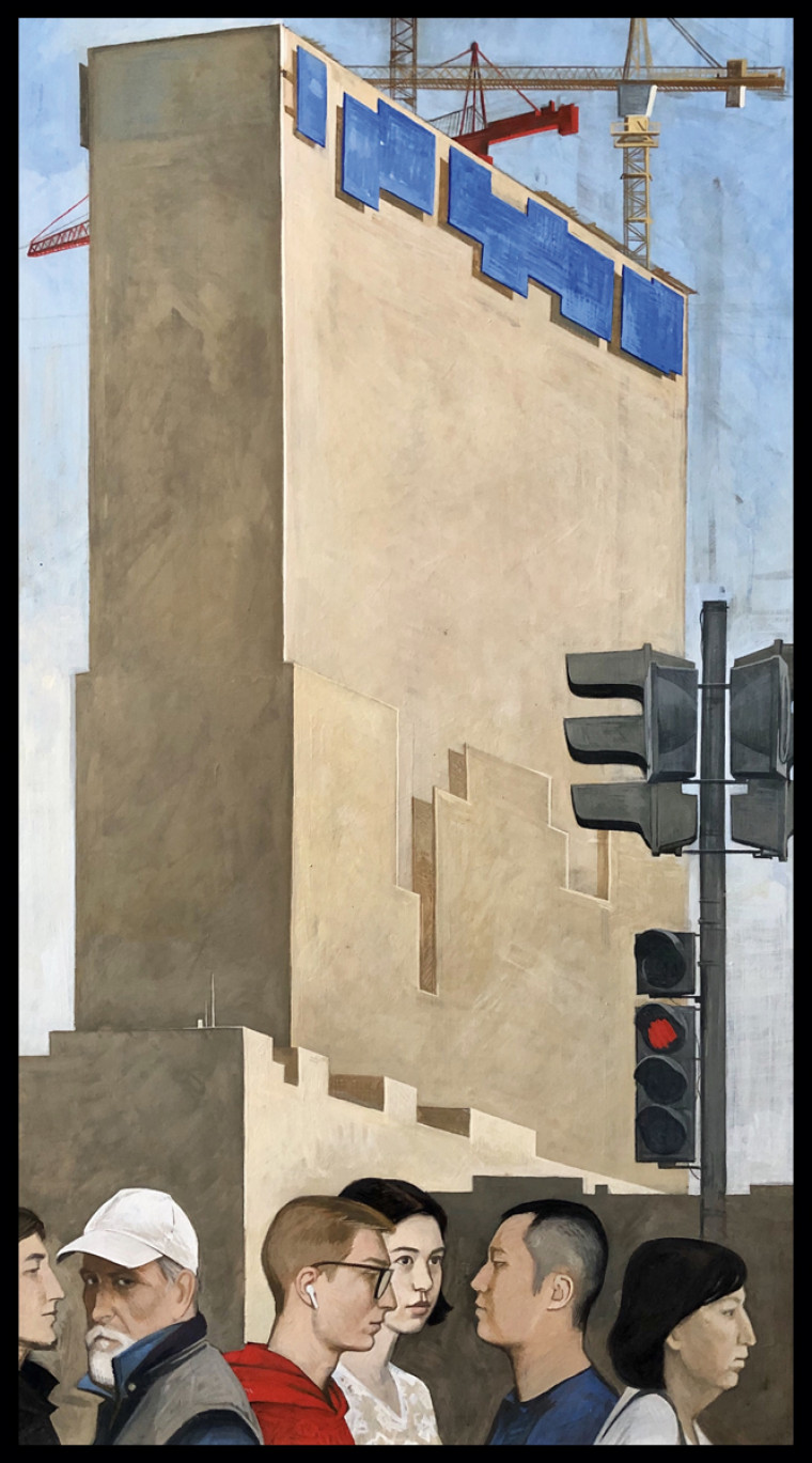 Architecture and urban space are the major concepts for Irina Zyuskina’s artwork. If a person appears in her paintings, most often it is a lonely figure suppressed by the volumes of the capital rush. The laconic and dry abbreviation “MSC” in the title of her work is also reflected in its composition. Monolithic walls resemble fortresses, the eyes slide over them with nothing to catch on. Buildings rise above Muscovites, whose heads are compositionally equalized, and their bodies are organized according to the rhythm of the city. They move by as always, minding their own business. However, a piercing gaze of one of the passers-by breaks the movement, introducing viewers into the space of the canvas