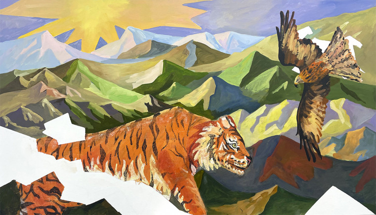 The ZIP group artistic practice resonates with the attempt at strengthening the cross-species equality. Thus animal world is frequently depicted in their projects. By making crabs, dolphins, tardigrades and jaguars the main characters of their paintings, the artists set connection with the non-human. The group living and working in Krasnodar pay special attention to the local context, especially the Southern Russian flora and fauna. The territory of the Caucasus was once inhabited by the Turanian tigers. The last representatives of this species became extinct in the middle of the 20th century.