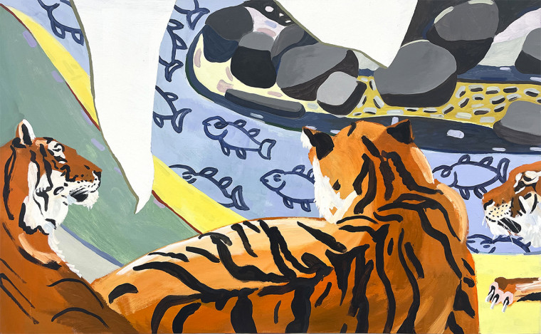 Combining their imagination with a digital one, artists create refracted mirage spaces — fused from the echo of a natural landscape, fairy motifs, glitch and patterns. The tiger in the paintings is adapting to the environment, trying to merges with it with his body repeating the rhythms of the surrounding space. White spots on the canvases resemble torn pieces of paper — this is how the artists signify the impossibility of these plots to be folded to the end.