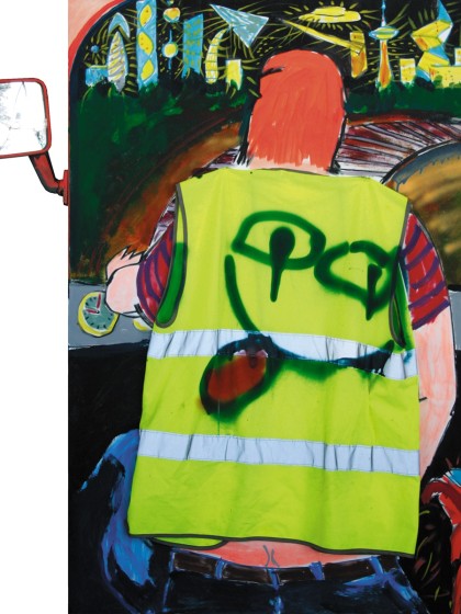 2014. 2014. Canvas, acryl, oil paints, markers, road services worker's vest, side mirror from Volkswagen Transporter manufactured in 1983. 90х125 cm.
