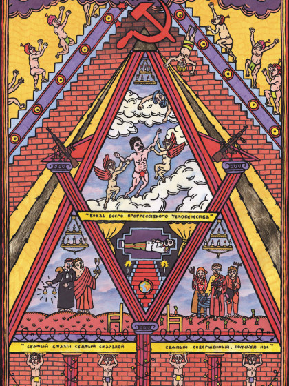 2015. Lino print, common picture, markers, acryl, brass leaf. Edition 1/10, authorly coloring. 65х96 сm.